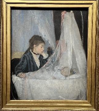 Berthe Morisot (1841-1895) est la grande figure féminine du mouvement impressionniste. Issue d’un milieu aisé, son père lui fait donner des cours de dessin et de peinture pour qu’elle réalise le portrait de sa mère. Berthe est douée et prend goût aux arts, elle décide d’en faire son métier. Elle rencontre Manet pour qui elle pose comme modèle à plusieurs reprises et qui l’influencera dans son œuvre. Elle n’épousera pas Edouard Manet mais son frère. En 1874 elle participe à la première exposition impressionniste que l’on n’appelait pas encore ainsi, où elle côtoie Pissarro, Monet, Cézanne, Renoir, etc. Elle représente beaucoup de femmes et d’enfants comme Le Berceau de 1872 (photo) restant ainsi dans la tradition de la peinture féminine. Ces portraits contribueront à sa célébrité mais elle saura apporter de l’originalité à ses tableaux comme dans sa toile Femme et enfant au balcon où les personnages sont représentés de dos. C’est une scène prise sur le vif et qui inspirera Manet pour la composition de son tableau Le chemin de fer. Manet a eu plusieurs élèves féminines qui étaient aussi modèles comme Victorine Meurant (1844-1927) dont nous avons peu de tableaux, ou Eva Gonzalès (1849-1883). De cette dernière on peut évoquer La loge qui montre le monde des demi-mondaines de l’époque qui en louant une loge au théâtre espérait attirer l’intérêt d’un homme riche et se marier ou en faire un amant. Influencée par son maître, Eva Gonzalès peindra plusieurs déclinaisons de l‘Olympia. Marie Bracquemond (1840-1916) sera une autre impressionniste qui peint sur toile mais aussi sur des poteries.