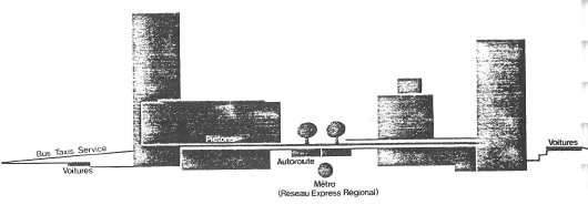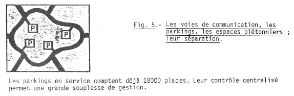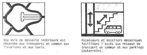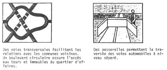 Les modes de transport prévus pour desservir ce quartier sont de 3 types : les routes et les parcs de stationnement, les transports en commun, l’esplanade réservée aux piétons. Le principe du système de voirie est de distinguer 3 réseaux correspondant à trois types de tracés différents. Une autoroute, la A14, absorbe le trafic de transit, le second réseau dessert la circulation régionale. L’élément principal de cette voie est un boulevard circulaire, dont la largeur varie de 3 à 5 voies (fig. 5).
