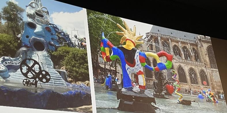 Niki de Saint-Phalle (1930-2002) est une autre artiste innovante qui travaille avec beaucoup d’imagination les couleurs primaires et les formes courbes. Elle collabore parfois avec son mari Jean Tinguely, figure majeure du « Cinétisme ». C’est elle qui obtient la commande d’Etat de la fontaine Stravinsky de Paris ; elle fera les personnages et sculptures colorées comme « L’Oiseau de Feu », son mari fera les mécanismes en mouvement d’où sortent les jets d’eau. Cette « fontaine » entre en résonance avec l’IRCAM qui la borde. Ils collaborent également pour le Cyclope à Milly-la-Forêt.