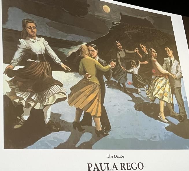 Parce que son père était parti travailler en Angleterre, Paula Rego (1935-2022) fait d’innombrables aller-retours entre le Portugal et Londres et par conséquent elle mêle l’originalité des mouvements pop-rock britanniques à la tradition de la société portugaise brimée par la dictature de Salazar. Ayant peu de moyens, elle utilise des matériaux tels que le papier mâché. Elle épouse l’artiste britannique Victor Willing qui l’impressionne fortement. Complexée par son mari, Paula Rego s’affirme tard, à la mort de son mari. Sa toile « The Dance » montre bien cette nouvelle liberté, « Maintenant que je suis veuve ».