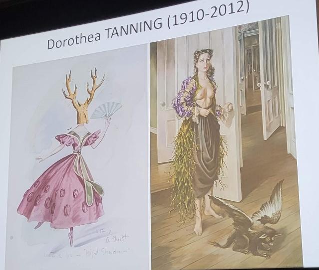 Dorothea Tanning (1910-2012) originaire d’une petite ville de l’Illinois, se joint au groupe des surréalistes de New York formé autour d’André Breton fuyant l’Europe en guerre, et rencontre Max Ernst qu’elle épousera. Ses œuvres figuratives mêlent le réel au rêve et ouvrent la porte à l’imagination. Fantasmes sexuels, angoisses et peurs de son père, homme imposant et tyrannique, caractérisent son univers onirique. Plusieurs de ses œuvres comportent des portes et des serrures symboles de l’inconscient chers aux Surréalistes. Sa peinture reprend de nombreux codes d‘Alice au pays des merveilles de Lewis Caroll.