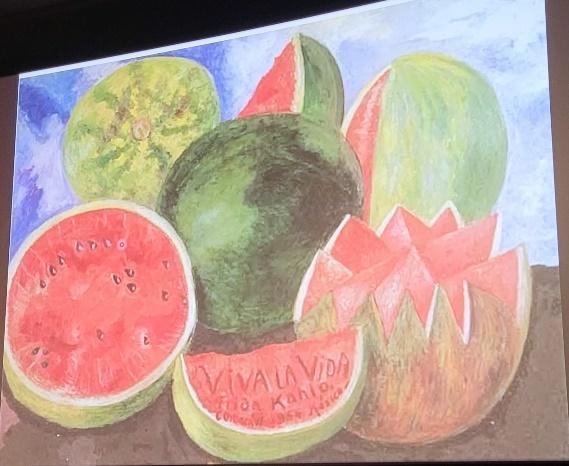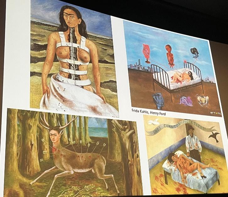 Elle épouse Diego Rivera célèbre muraliste mexicain mais ce dernier aime séduire et a plusieurs maîtresses, de son côté Frida succombe au charme de Léon Trotsky, réfugié au Mexique. Frida Kahlo montre sa souffrance morale et physique dans plusieurs tableaux comme « Le cerf blessé » (1946), « Henry Ford Hospital » (1932) suite à plusieurs fausses couches ou « Unos cuantos piquetitos » (1935). L’état de santé de l’artiste se dégrade au début des années 1950 et alors qu’elle est mourante elle peint une dernière toile, une nature morte avec la phrase « viva la vida » écrite sur une tranche de pastèque. La peinture de Frida Kahlo a marqué la culture mexicaine mais aussi celle du continent américain dans son ensemble. Ses œuvres sont un véritable journal intime et reflètent sa vie très mouvementée. Frida Kahlo exècre les surréalistes européens mais sa peinture pourrait faire partie du mouvement surréaliste. André Breton, théoricien du mouvement, dira que la peinture de Frida Kahlo est un ruban attaché à une bombe.