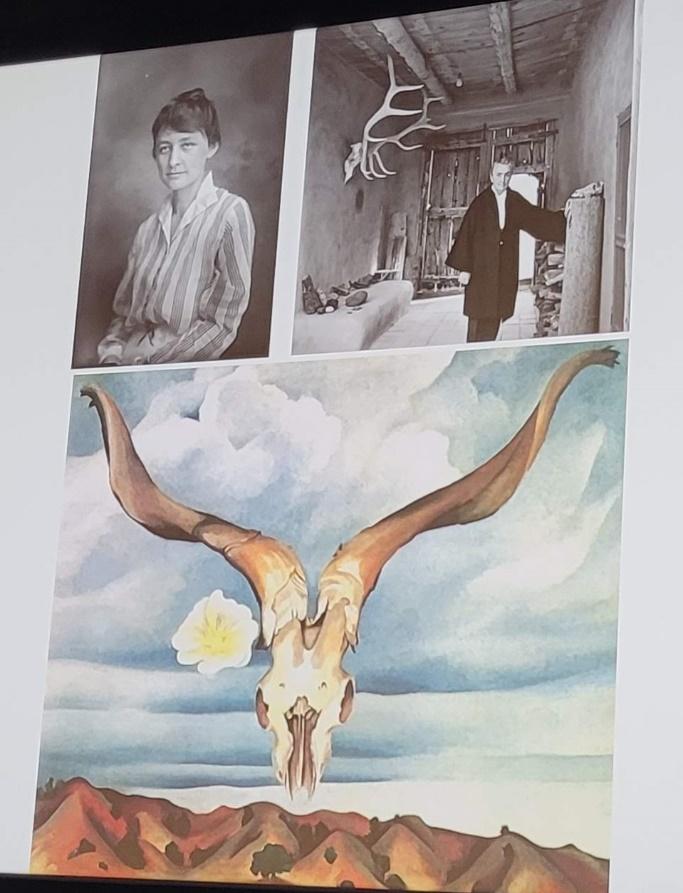 Le pendant étasunien de Frida Kahlo est Georgia O’Keeffe (1887-1986). Cette dernière cherchant à casser le cliché qui consistait à penser que les femmes artistes peignaient une peinture « sage », essentiellement des enfants et des fleurs, peint des fleurs mais en gros plans avec des formes très équivoques. On peut rappeler que la représentation de la nudité est très codifiée même pour les peintres masculins et ce n’est qu’au début du XXe siècle avec Suzanne Valadon qu’une femme ose peindre un homme nu, tout en devant affronter la censure. On peut donc voir à quel point les tableaux de Georgia O’Keeffe sont transgressifs. Avec humour, elle soulève le paradoxe: « pourquoi les femmes ont-elles le droit de représenter des fleurs et pas de montrer des sexes, alors que les fleurs sont les organes reproducteurs (donc, les sexes) des végétaux? » Dans la seconde partie de sa vie, l’artiste s’installe dans le désert du Nouveau Mexique et le peint de manière poétique. Loin des clichés d’une peinture doucereuse réservée aux femmes, ses paysages dégagent une grande force et brouillent les pistes entre figuration et abstraction, réalisme et onirisme.