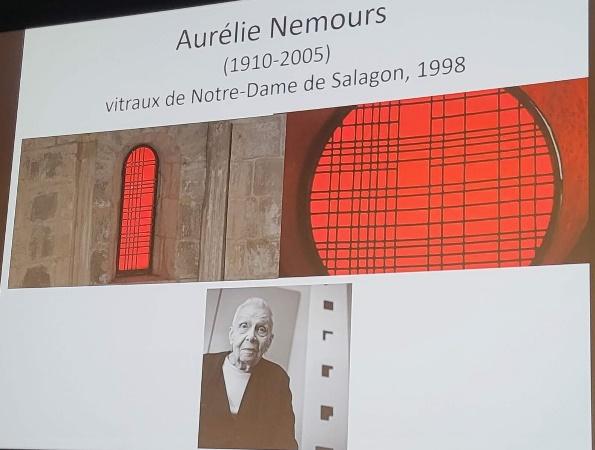 Certaines artistes seront mises en avant grâce au mécénat de la Cinquième République comme ce fut le cas d’Aurélie Nemours (1910-2005) qui réalisa les vitraux du Prieuré de Salagon. C’est une artiste qui s’inscrit dans l’art abstrait géométrique. Ses vitraux du Prieuré sont l’aboutissement de ses recherches plastiques : on y retrouve les formes essentielles de son art, le carré et le rectangle, et ses réflexions sur le monochrome et la couleur.