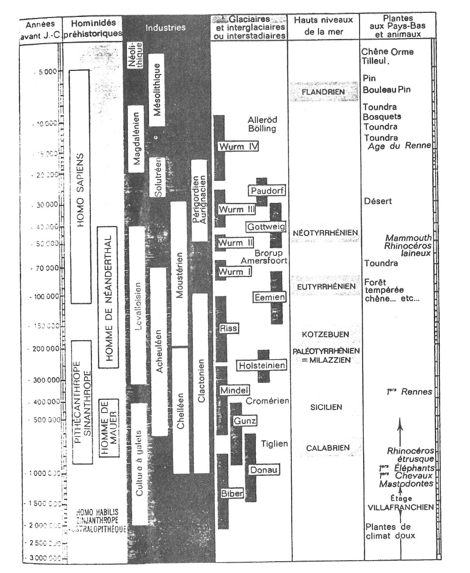 À partir de tout cela, on peut tenter une chronologie du quaternaire, complexe, souvent rectifiée à mesure des nouvelles découvertes, dans laquelle il est parfois difficile de synchroniser deux échelles : l’échelle préhistorique et l’échelle géologique
