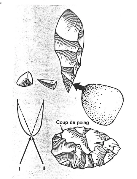. Chelléen ( : Abbevillien) ; l’instrument caractéristique est le « coup de poing », bloc de silex, quelque peu ovale, taillé à grands éclats sur chaque face (fig. 5) ; les bords, quand ils ne sont pas retouchés, sont en zigzag.