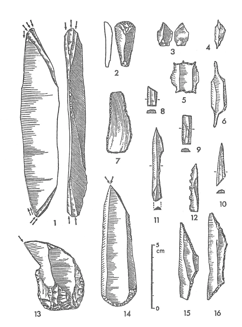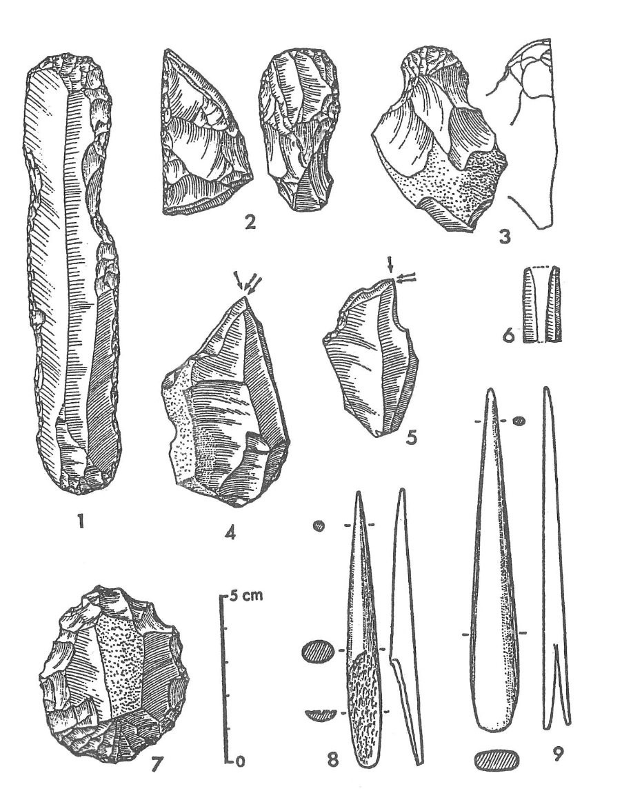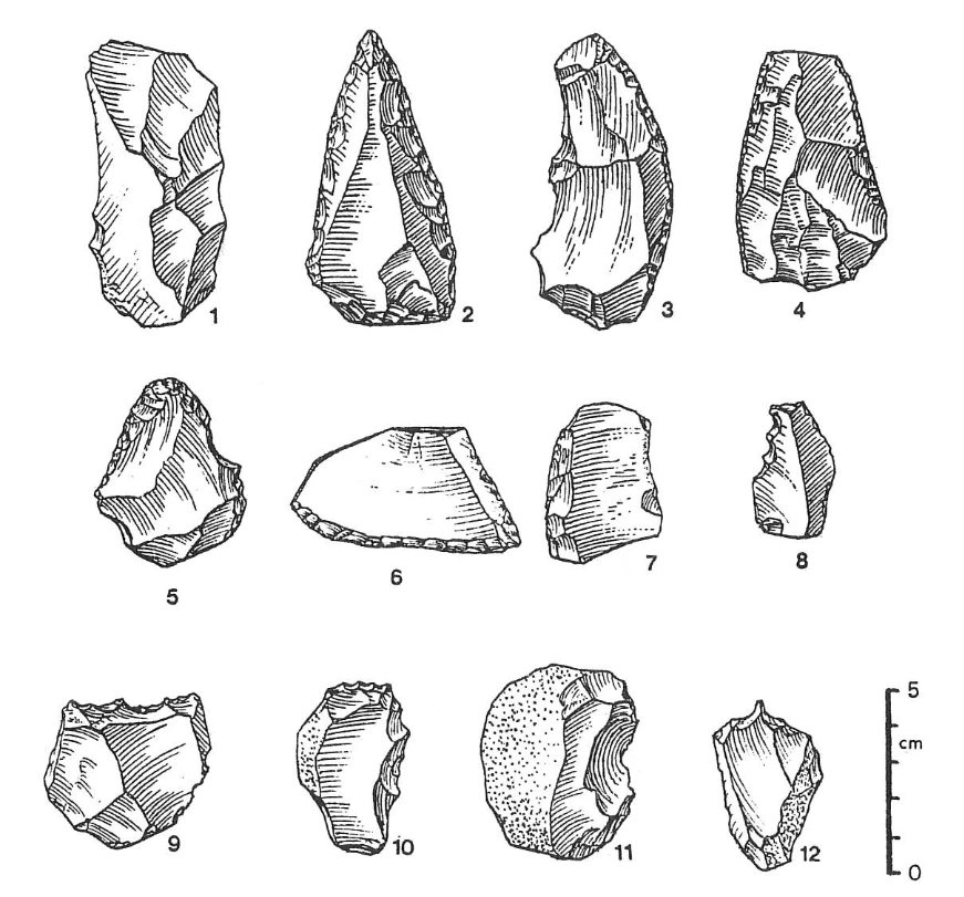 L’outillage se perfectionne et se spécialise : bifaces en pointe ou en forme de cœur ; pointes diverses ; racloirs ; couteaux à dos, etc…