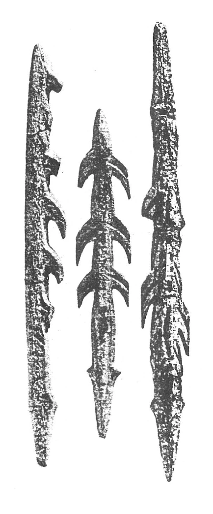 Le travail de l’os se développe remarquablement : sagaies, harpons (fig. 10) à un ou deux rangs de crochets, aiguilles à chas. Le climat est rigoureux. C’est l’époque du Renne.