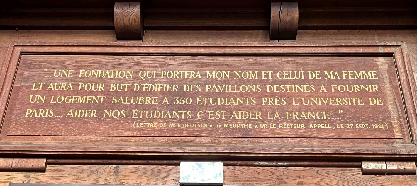 Un peu d’histoire : « Au lendemain de la Première Guerre mondiale, un projet ambitieux voit le jour : créer un lieu de vie ouvert aux étudiants du monde entier, fondé sur la paix, le dialogue des cultures et la coopération internationale. Portée par des personnalités engagées, des intellectuels visionnaires et des philanthropes, comme le mathématicien Paul Appell ou l’industriel lorrain Emile Deutsch de la Meurthe, la Cité internationale universitaire de Paris naît de cette volonté de bâtir un monde plus juste à travers l’éducation et les rencontres humaines. Un lieu unique, pensé comme une « école des relations humaines », où l’architecture, le savoir et le vivre-ensemble s’enracinent dans un même idéal ». (d’après https://www.ciup.fr/histoire/ )