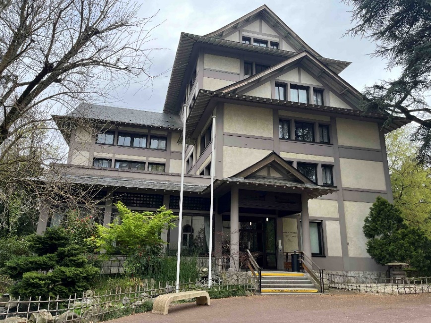 Après avoir longé la Maison des Étudiants Canadiens, la Maison de l’Argentine, traversé la grande zone d’accueil de la Cité, longé la Fondation des États-Unis, jeté un coup d’œil à la Maison du Mexique, laissé le Collège Franco-Britannique sur notre droite, nous arrivons à la Maison du Japon, deuxième étape du circuit de découverte. Si certaines Maisons ne se caractérisent pas par leur architecture, ce n’est pas le cas de cette Maison du Japon, immédiatement identifiable par son architecture typique et ses jardins caractéristiques. A l’intérieur, nous sommes accueillis par les œuvres de Tsuguharu Fujita, ce magicien du trait, exécutées en 1929.
