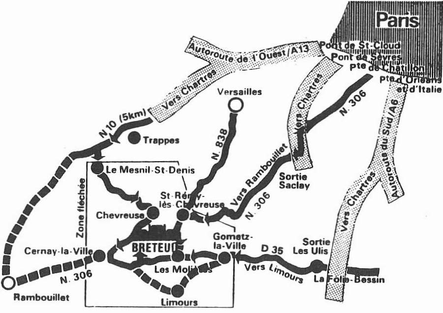 Un regard vers Saint-Jean de Beauregard, qui nous accueillit voici déjà quelques années, et dont nous gardons, entre autres, le souvenir du Colombier et des « conservatoires à raisins », et nous traversons ces excroissances de la Grande Banlieue qui groupent, plus ou moins heureusement, immeubles et installations modernes, résidences luxueuses, vieux villages où la meulière du pays se maintient difficilement et fermes qui survivent au milieu de leurs champs et de leurs terres.