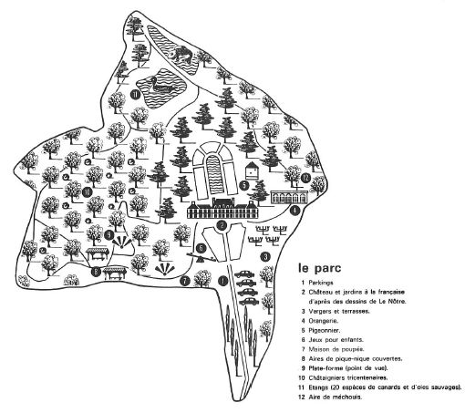 Faisons encore quelques pas dans le parc, dans la partie tout au moins qui reste agreste et très « jardins à la française » autour du Colombier, regardons les douves, qui n’ont jamais été fossés, mais qui, larges et bien dégagées, éclairent les sous-sols où s’activaient cuisiniers et serviteurs, et sans trop nous attarder sur les engins de terrassement qui préparent pour la belle saison les aires de méchoui, regagnons notre car.