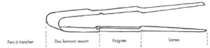 . Le cueilleur de jambe apporte au bout d’un « ferret » (petite canne pleine) un petit morceau de verre que le poseur de jambe coupe à l’aide de ses ciseaux, fixe à la « paraison » et façonne.