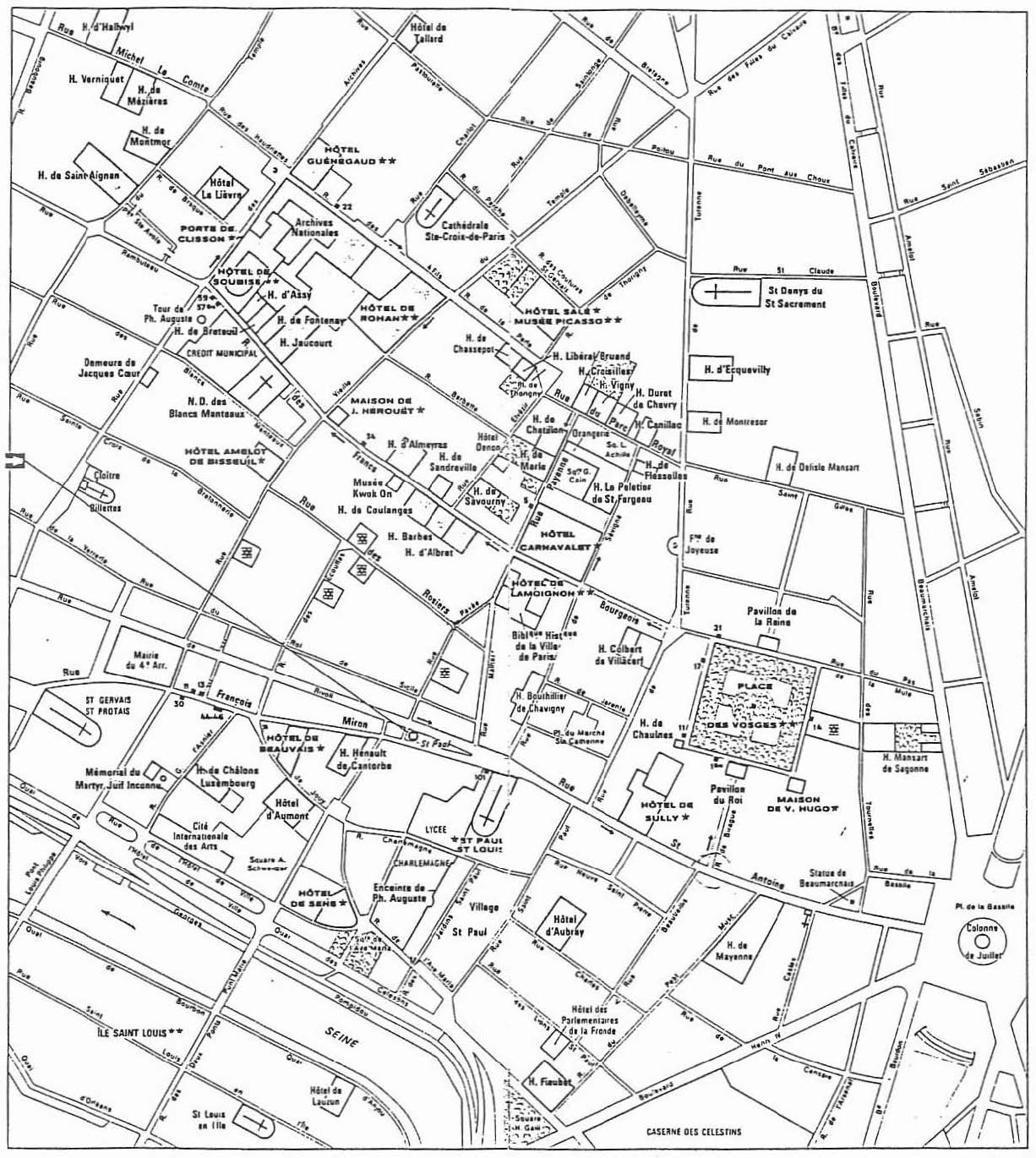 Nous nous arrêtons dans la cour de l’hôtel de Lamoignon. Anciennement appelé hôtel d’Angoulême, il a été élevé vers 1585 pour Diane de France, fille légitimée de Henri II. Le Président au Parlement Lamoignon s’y installa en 1658 et reçut Racine, Madame de Sévigné, Bourdaloue, Boileau qui, sur un défi, compose le « Lutrin », épopée héroïco-comique. Le défenseur de Louis XVI, Lamoignon de Malesherbes y est né, Alphonse Daudet y a habité.