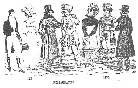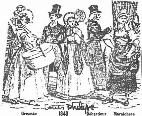 A l’époque Louis Philippe, la taille retrouve progressivement sa hauteur naturelle et la jupe continue à s’évaser avec des volants.