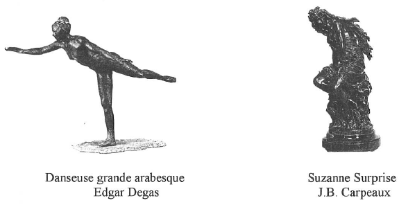 Cela est net également pour la sculpture. Les bronzes surtout, permettent de suivre l’évolution de cet art, de Barye à Carpeaux, Dalou, Rodin, Bourdelle, avec quelques pièces comme Suzanne surprise de Carpeaux, Danseuse grande arabesque de Degas, ou encore Le bélier rétif de Bourdelle.
