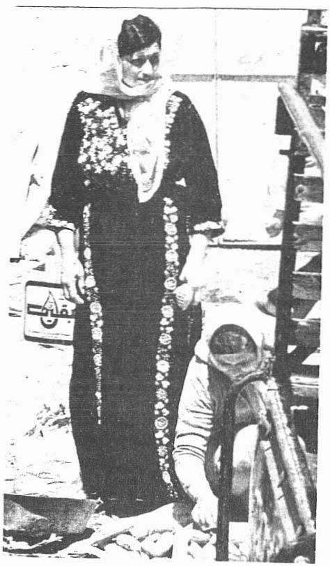 Des femmes originaires de réglons différentes se retrouvent dans le souk des textiles pour faire des achats. Deux d’entre elles viennent de Naplouse : celle qui porte une robe verte en rayonne damassée, de style espagnol, est vêtue de façon « traditionnelle-moderne », car la coupe de sa robe – traditionnelle en soi – montre des influences occidentales. Sa compagne, en manteau de velours synthétique violet d’où dépasse une robe blanche, elle aussi en étoffe synthétique, a opté pour le style traditionnel.