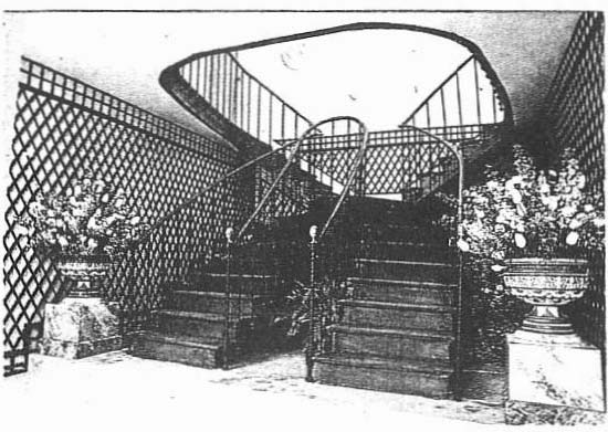 Chateaubriand l’aurait, d’ailleurs, récupéré sur un brick anglais démâté … Les degrés dont il est flanqué à droite et à gauche ont été dessinés par Chateaubriand. Ils étaient toujours ornés de plantes et de pots de fleurs. Le fonds de treillage vert, le chemin de tapis à feuillage, les vases en fonte genre Wedgood datant de la moitié du XIXème siècle et les médaillons à l’antique confèrent un caractère très anglais à cet escalier.