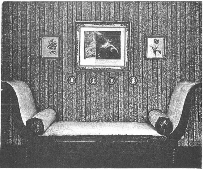 La Véranda occupe une partie de l’aile ajoutée par Mathieu de Montmorency en 1820. C’est à lui qu’est due aussi la petite chapelle, de pur style Restauration, que l’on aperçoit à proximité. Juste en face, sur une commode, le buste en terre cuite de Juliette Récamier se détache sur le fond de verdure. Il est signé Joseph Chinard, sculpteur lyonnais très apprécié à la fin du XVIIIème siècle et au XIXème siècle, qui exécutera de nombreux bustes et médaillons de l’Empereur et de Joséphine.