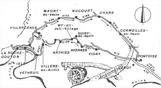 Nous traversons alors le Vexin. Dans ce voyage, il ne faut ni s’arrêter, ni hésiter sur notre itinéraire. Si nous nous arrêtions à Pontoise, Pissarro nous retiendrait longuement, et nous le verrions avec ses amis vivre leurs passions, nous retrouverions ses maisons, il nous accueillerait dans son musée avant que nous le retrouvions, peut-être à la « Fête d’Osny » ou devant les « Peupliers à Éragny » avec Monet. Si nous hésitions, chaque carrefour nous proposerait un choix de personnages à retrouver ou à découvrir, aussi différents que la coquette Ninon de Lenclos ou le turbulent général Grouchy.
