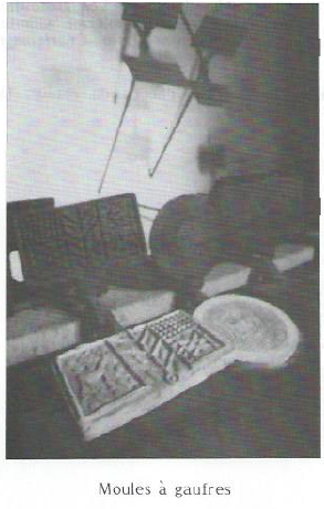 De part et d’autre du loyer romain, un rouable (perche à crochet pour tirer la braise du four), une pelle à enfourner, des crosses à fagot de la forêt d’Arthies. A gauche, une collection de moules à gaufres en fer forgé (on disait autrefois, moules à nieules ou à oublies) qui va du XVIème au XIXème siècle, la plupart naïvement décorés de motifs religieux ou profanes, chefs-d’œuvre de forgerons de village qui les exécutaient traditionnellement pour les nouveaux mariés.