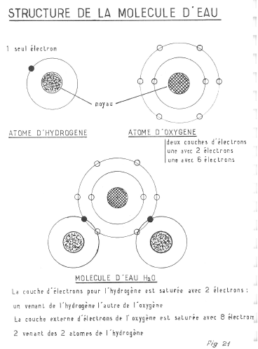 - la molécule d’eau, composée de deux atomes d’hydrogène et d’un atome d’oxygène, est d’une grande stabilité, les trois atomes étant accrochés entre eux par des électrons qu’ils mettent en commun, ce qui porte la couche d’électrons de l’hydrogène à 2 (nombre maximal), et la deuxième couche d’électrons de l’oxygène à 8 (nombre maximal) (fig. 21).