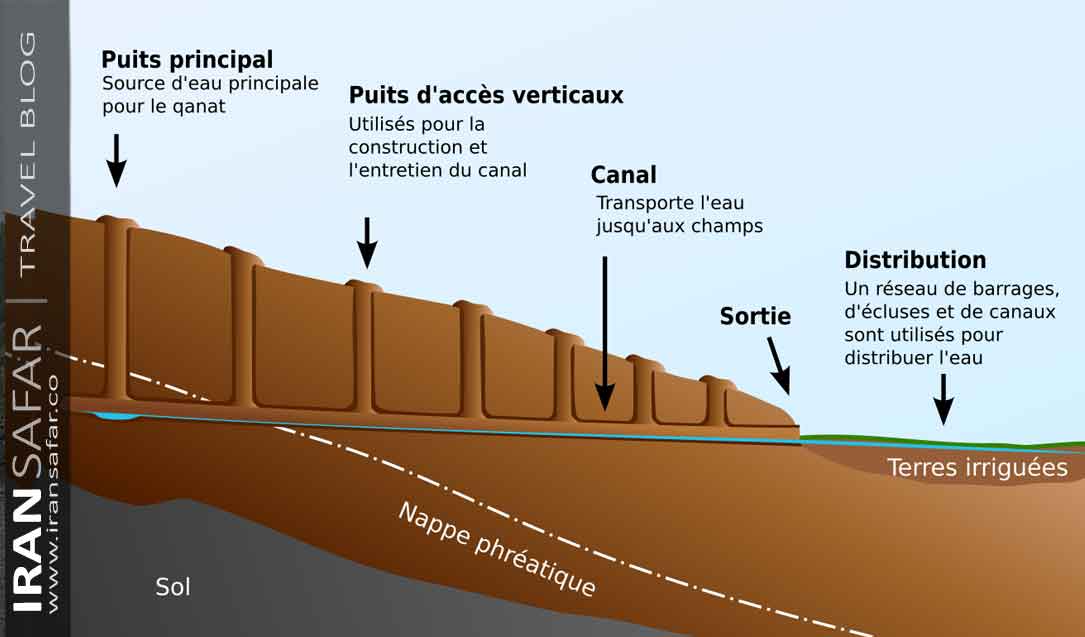 Les qanats sont des ouvrages traditionnels entretenus de génération en génération par des artisans qui leur sont dédiés. Bien qu’en déclin, bon nombre de qanats sont encore parfois exploités aujourd’hui, et permettent l’irrigation de 20% des terres cultivées d’Iran. D’origine persane, la technique des qanats s’est diffusée au fil du temps vers l’Inde et la Chine par la route de la soie puis vers l’Ouest, en Afrique du Nord et en Espagne au cours des invasions arabes. Elle fut par la suite transmise aux colonies espagnoles à partir du XVe siècle.