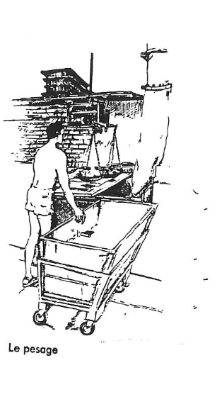 Le boulanger forme des pâtons à l’aide du coupe-pâte et les pèse à 2,100 kg. Nous apprécions le petit coup de main qui lui permet de prendre à la volée un pâton de 2,100 kg et non pas de 2 kg seulement. La balance ne servant qu’à confirmer.