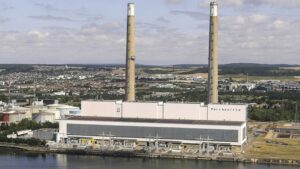 Nous admirons les quatre cheminées, colosses de béton de 220 m de hauteur ainsi que les chaudières suspendues par le haut.