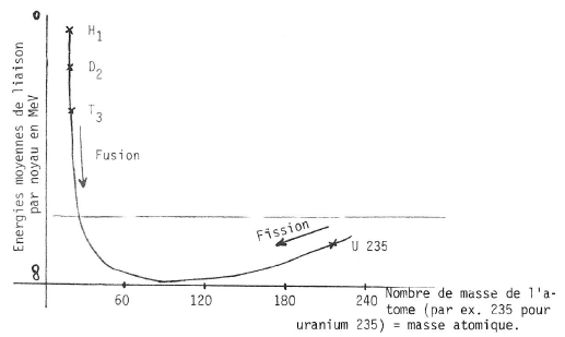 A mesure que la masse atomique augmente, la courbe descend rapidement ; elle atteint son minimum de 60 ( 8,7 MeV par noyau), puis augmente lentement jusqu’aux noyaux les plus lourds (par ex. U235).