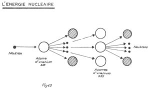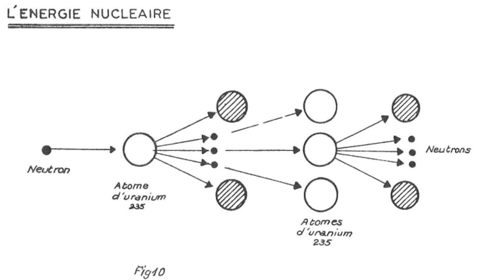 Ces neutrons, projetés à grande vitesse, sont ralentis par des « modérateurs » ; ils deviennent alors « thermiques », ce qui augmente la probabilité de leurs chocs avec d’autres atomes d’uranium 235 ; d’où de nouvelles fissions ; d’où la possibilité d’obtenir une succession ininterrompue de fissions, chacune d’elles en provoquant une ou plusieurs autres ; c’est la réaction en chaîne. Comme chaque fission libère de l’énergie, finalement il y a production de chaleur. (fig. 10)