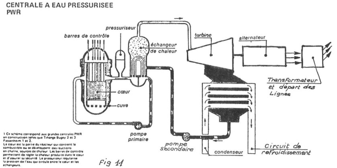 Dans un réacteur nucléaire, l’uranium 235 est placé dans le cœur du réacteur ; de l’eau sous pression circule dans un circuit primaire et emmène la chaleur dans un générateur de vapeur ; là, de l’eau se vaporise et la vapeur produite est conduite, par un circuit secondaire, vers les turbines qui font tourner les alternateurs ; la vapeur, détendue dans les turbines, est refroidie par l’eau d’un troisième circuit (circuit de refroidissement), et renvoyée en générateur de vapeur. Les deux premiers circuits sont des circuits fermés. (fig. 11)