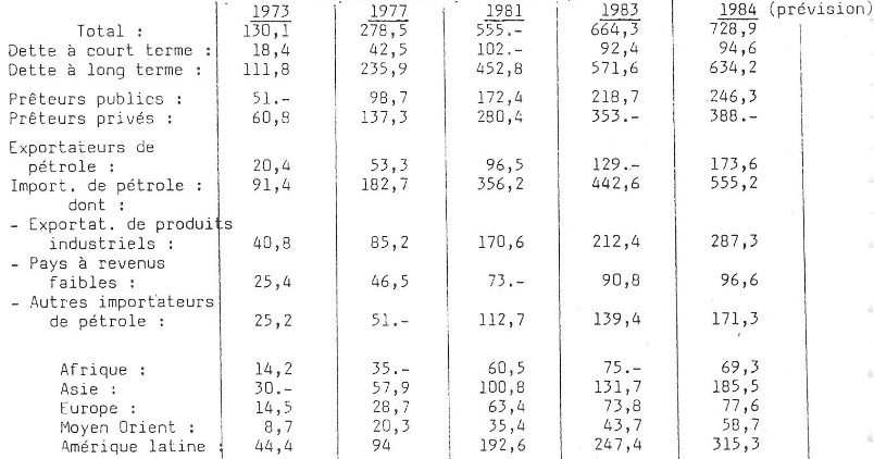 L’endettement est passé de 130 à 685 milliards de dollars représentant respectivement 20 et 25% du Produit National Brut des pays débiteurs. L’endettement avait donc quintuplé en dix ans.