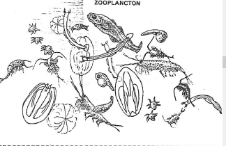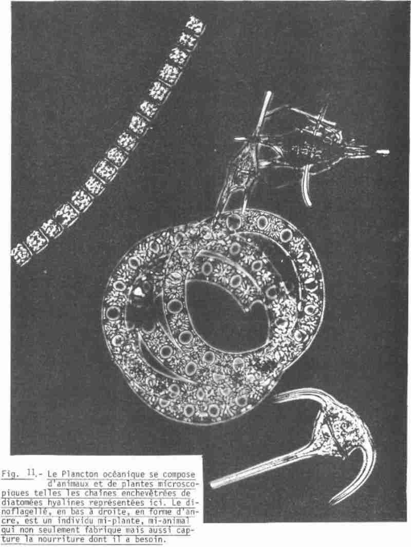 Certains petits Crustacés mesurant de 1 à 10 millimètres, les Copépodes constituent l’élément dominant du zooplancton marin (60 à 90%) et jouent un rôle fondamental dans le cycle biologique des océans : grands consommateurs d’algues unicellulaires microscopiques formant le phytoplancton et de divers éléments du microzooplancton (œufs, larves, …) ; ils servent eux-mêmes de nourriture à beaucoup de carnivores macroscopiques (Crustacés, Méduses, Poissons, …) : ils représentent un des maillons essentiels de la chaine alimentaire océanique (fig. 11).