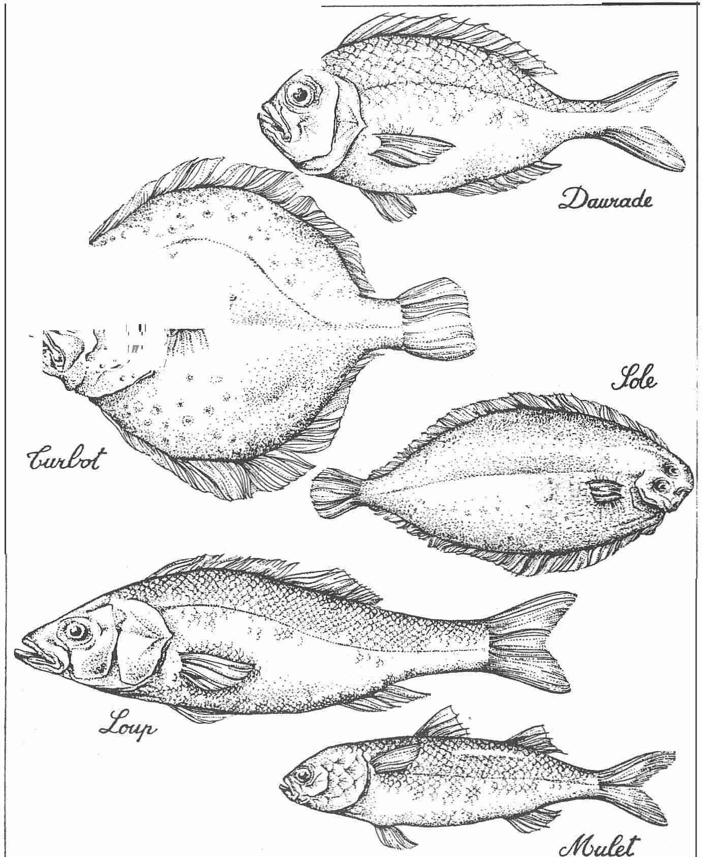 - Poissons plats : (Turbots et Soles) production artificielle au stade expérimental.