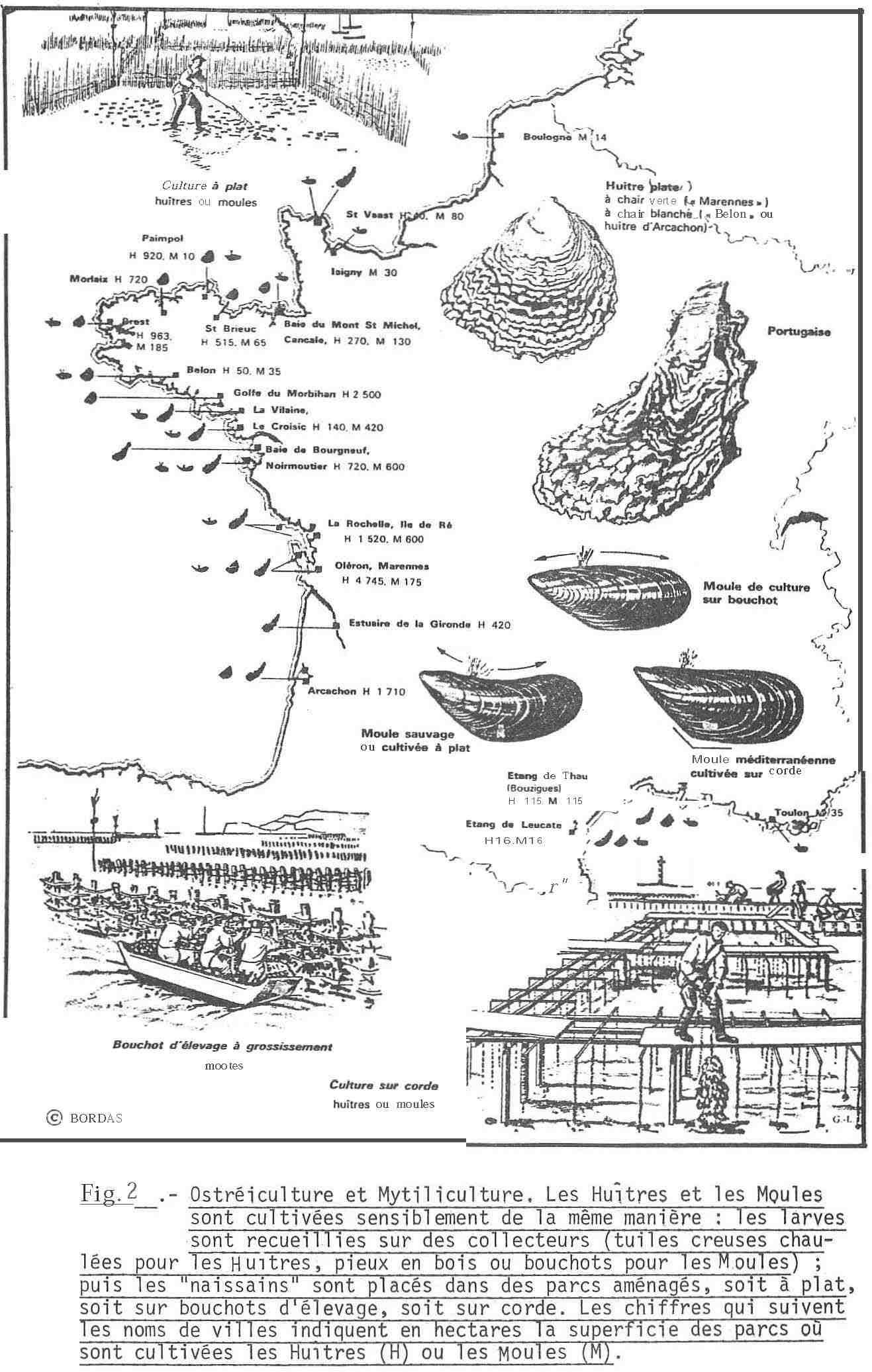 La conchyliculture (Moules, Huîtres et autres coquillages) est la plus développée des productions aquacoles françaises avec 175 000 tonnes par an (fig. 2.).
