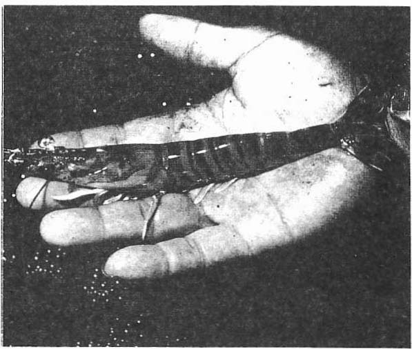 Fig.7. Ces demoiselles des mers poussent l’élégance changer de toilette tous les huit jours en abandonnant leur carapace pour une·nouvelle tenue plus à leur taille. La mue d’une crevette ressemble un ballet ou un strip-tease dansé. Avec force sauts, détentes, entrechats, des pattes et de la queue, celles-ci réussissent à dépouiller l’ancienne enveloppe et, rapidement, se refont un nouvel habit.