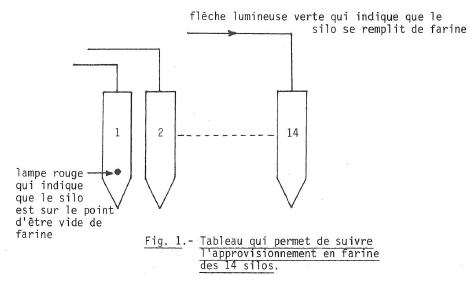 Avant cela, il y a le stockage des matières premières : la farine de blé tendre et le sucre cristallisé sont stockés dans des silos de 20 mètres de haut. L’approvisionnement des silos est suivi sur un tableau lumineux (fig. 1).