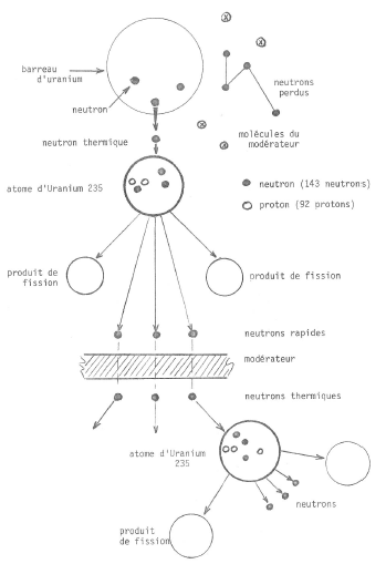 La vitesse des neutrons est considérablement ralentie (20 Km/sec) ; ils deviennent des neutrons « thermiques » susceptibles de briser le noyau d’uranium 235.