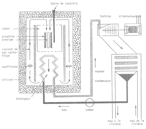 Elle utilise l’Uranium naturel comme combustible, le graphite comme modérateur et le gaz carbonique sous pression comme fluide caloporteur (fig. 3).