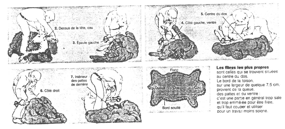 Le bord de la toison, sur une largeur de quelque 7,5 cm. provient de la queue, des pattes et du ventre, c’est une partie en général trop sale et trop emmêlée pour être filée. qu’il faut couper et utiliser pour un travail moins soigné.