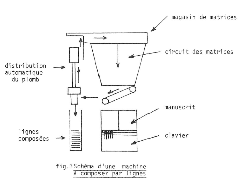 Chaque fois que l’opérateur frappe une touche d’un clavier, une matrice en cuivre de la lettre ou du signe est sortie du magasin des caractères pour être présentée devant un creuset qui lui injecte du plomb fondu (en réalité : plomb + étain + antimoine). Les caractères sont fondus, avec des espacements, en lignes justifiées, c’est à dire ayant la longueur souhaitée (par exemple, largeur d’une colonne) (fig. 1).