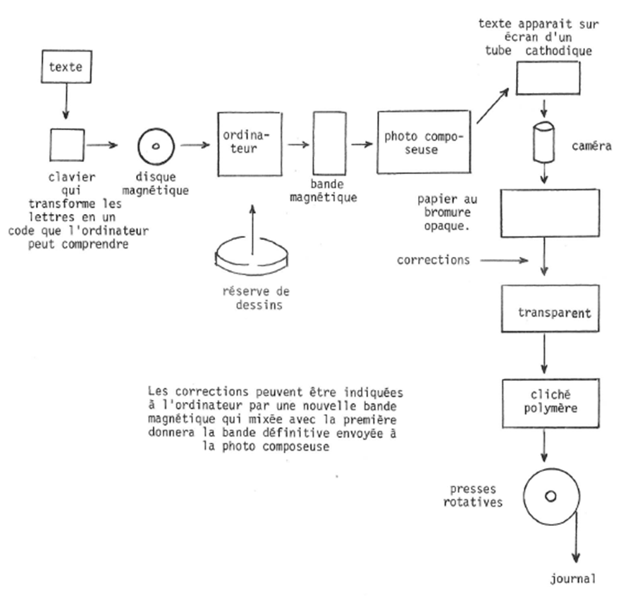 Les clavistes tapent les textes, par tranches de 4000 caractères qui sont mis en mémoire sur des disques magnétiques capables de stocker 500000 caractères, alors qu’un article moyen de journal comprend 6000 caractères ; en moyenne, un disque correspond donc à 80 articles. Les clavistes tapent en continu sans se soucier de la justification, de la taille des lettres, des coupures syllabiques.