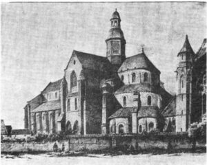 L’église actuelle date du 12ème siècle, témoin du style roman-ogival. Elle est en forme de croix latine et la tête se termine en hémicycle. Le clocher, haut de 60 mètres, de forme octogonale surmonté d’une lanterne, date de 1754. Le chœur (14 mètres) est très court, comparativement à la nef (44 mètres) qui, d’ailleurs n’est pas complète, car elle a été raccourcie d’une travée lorsqu’en 1414, la façade primitive, flanquée de 2 tours, fut détruite par les Bourguignons ; celle-ci fut terminée plus tard par un mur en briques, au milieu duquel on pratiqua une grande fenêtre de style ogival, surmontée de l’écusson de Guy de Villiers de l’Isle-Adam, évêque de Beauvais, qui fut le dernier abbé régulier. A l’intérieur, on compte 62 piliers, et 556 colonnes d’une légèreté et d’une élégance rares.