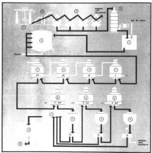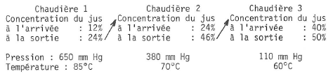Il ne faut pas dépasser finalement la température de 60°C ; on opère, par étapes successives, dans trois chaudières, sous vide partiel (nous dirons pourquoi dans un instant).
