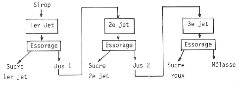 L’eau-mère du 2ème jet, toujours riche en sucre, est à son tour réincorporée dans le cycle de cuisson + malaxage + essorage, pour donner un sucre de 3ème jet brun et petit.