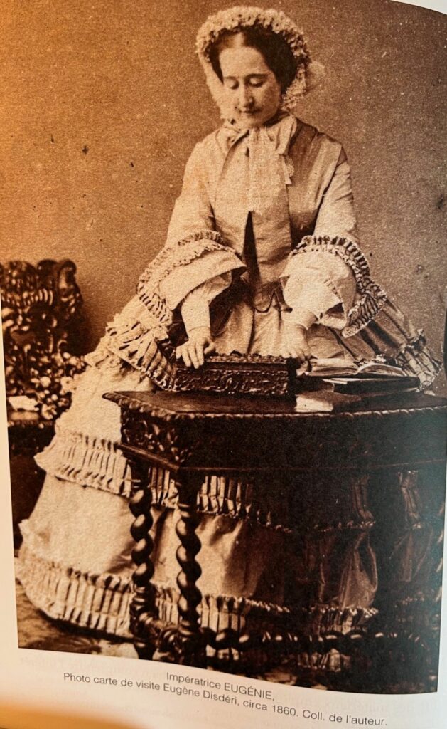 Napoléon III étant malade, c’est l’impératrice Eugénie qui se rend en Égypte. Après le départ de Saint-Cloud le 30 septembre 1869, le voyage jusqu’en Égypte dure deux mois, jusqu’à l’inauguration le 17 novembre ; ce voyage est jalonné de plusieurs escales dont à Magenta où l’impératrice rend un hommage aux généraux français de la bataille de 1859. Le 2 octobre Eugénie arrive à Venise où elle est reçue avec tous les honneurs qui lui sont dus. Le 11 octobre c’est l’escale à Athènes puis le Bosphore et un grandiose dîner offert par le sultan Abdul Aziz à Constantinople suivi de trois jours de festivités du 15 au 18 octobre. Finalement Eugénie atteint Le Caire le 22 octobre. Entre le 27 octobre et le 15 novembre l’impératrice réalise plusieurs excursions sur le Nil et visite Louxor, Karnak, Giseh et Edfou. Nous avons plusieurs témoignages de ce long voyage grâce aux souvenirs publiés par une des demoiselles d’honneur de l’impératrice, Marie de Larminat (1848-1927) mais aussi le récit inédit de la dame d’honneur la Comtesse de Nadaillac et le journal intime de Marie Redel (1834-1916), la gouvernante de la Duchesse d’Albe, nièce de l’impératrice. Ces témoignages nous permettent de connaître beaucoup de détails sur ce voyage comme les toilettes ou l’état d’esprit d’Eugénie.