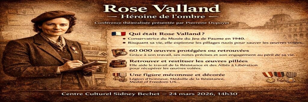 Rose VALLAND est une jeune fille de condition modeste, née dans la région lyonnaise en 1898. Passionnée de dessin, elle devient attachée de Conservation au Musée du jeu de Paume. La guerre éclate. Les armées d’Hitler s’emparent impunément des œuvres d’Art au Louvre et pillent les appartements des familles juives. Les chefs d’œuvre dérobés, avant d’être acheminés en Allemagne, transitent par le Jeu de Paume. C’est là que Rose Valland, dans le plus grand secret, note sur des carnets tout ce qu’elle voit de ce pillage. Elle fait également œuvre de Résistance en veillant à ce que les wagons contenant les œuvres d’Art ne soient pas bombardés par les Alliés ! Sur 100 000 œuvres d’art pillées par les nazis, Rose permettra d’en retrouver 60 000 Elle a été surnommée « La Capitaine Beaux-Arts ».