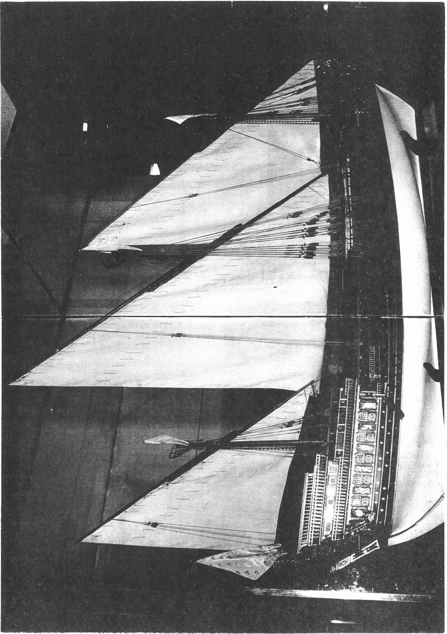 Le mât central est pourvu d’une vergue orientant, au moyen de bras, une voile carrée munie de cargues.