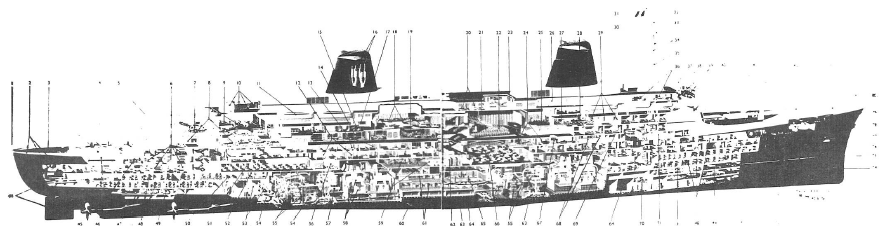 On voit la cabine radio, la passerelle, la cuisine et la salle de contrôle du moteur. Cette dernière est une pièce insonorisée pour la surveillance des moteurs. On ne pénètre plus dans les salles de machines.